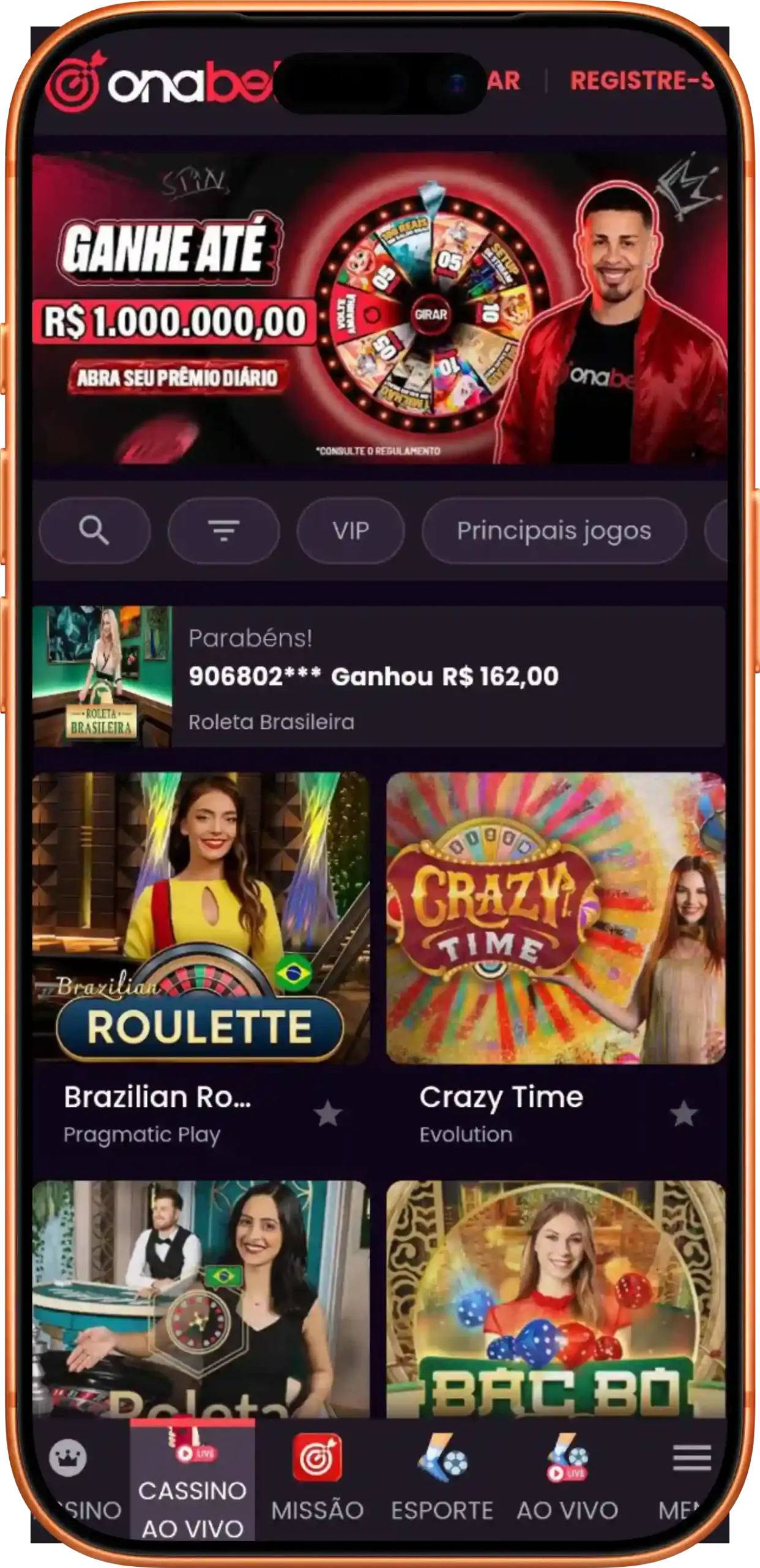 Outro tipo de entretenimento interessante da Onabet Brasil é o setor de casino ao vivo. Aqui você tem a oportunidade de “sentar” em mesas virtuais e jogar com profissionais em tempo real. Os dealers performam as ações na mesa e você joga casino online através da interface do jogo, tudo isso com transmissão de qualidade via streaming. Os maiores sucessos aqui são:
